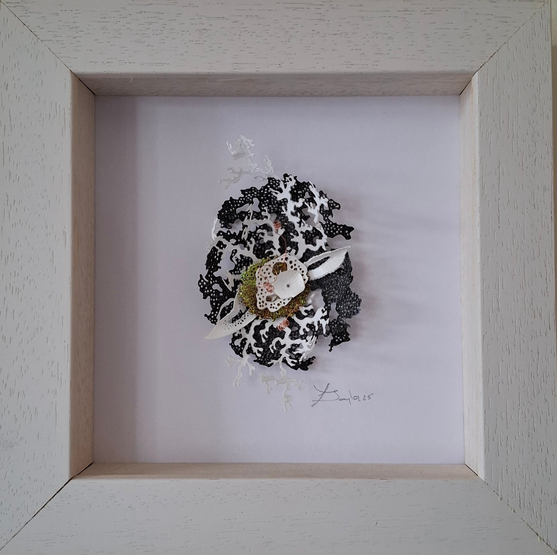 Hand cut out inks on recyclable synthetic paper and copper wire. 195mm x 195mm