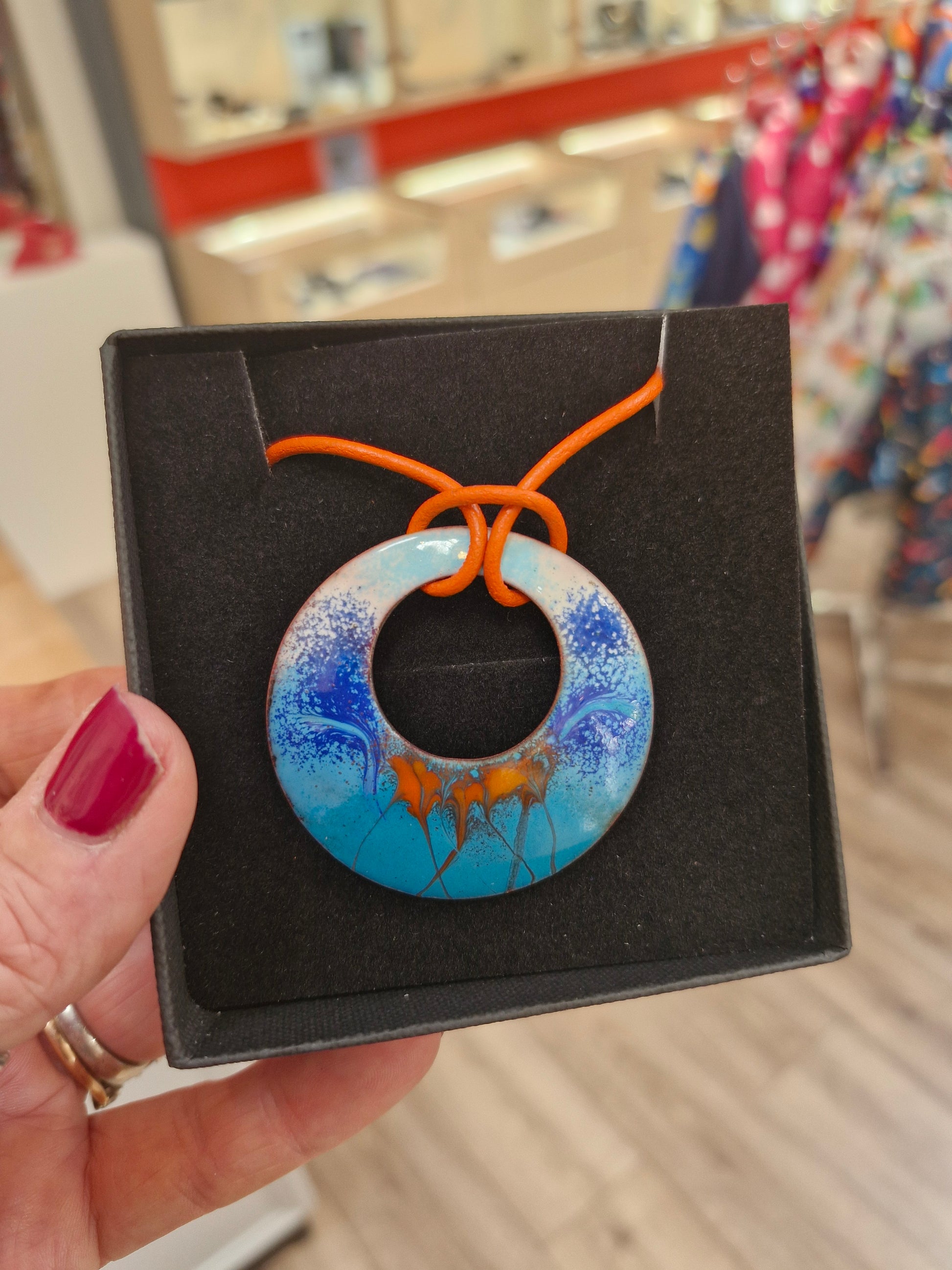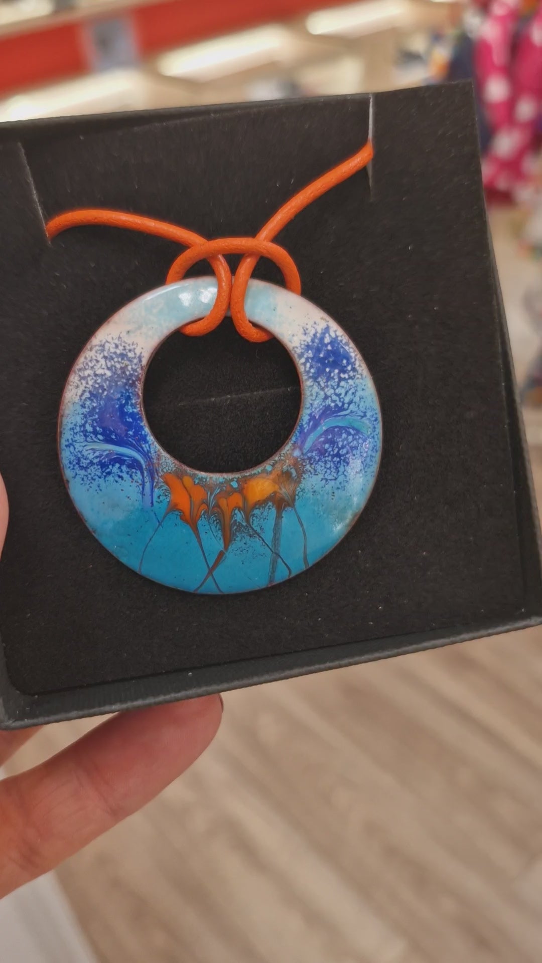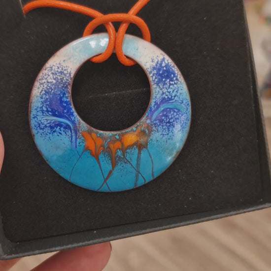 Turquoise and orange enamel necklace, statement necklace, torch fired enamel