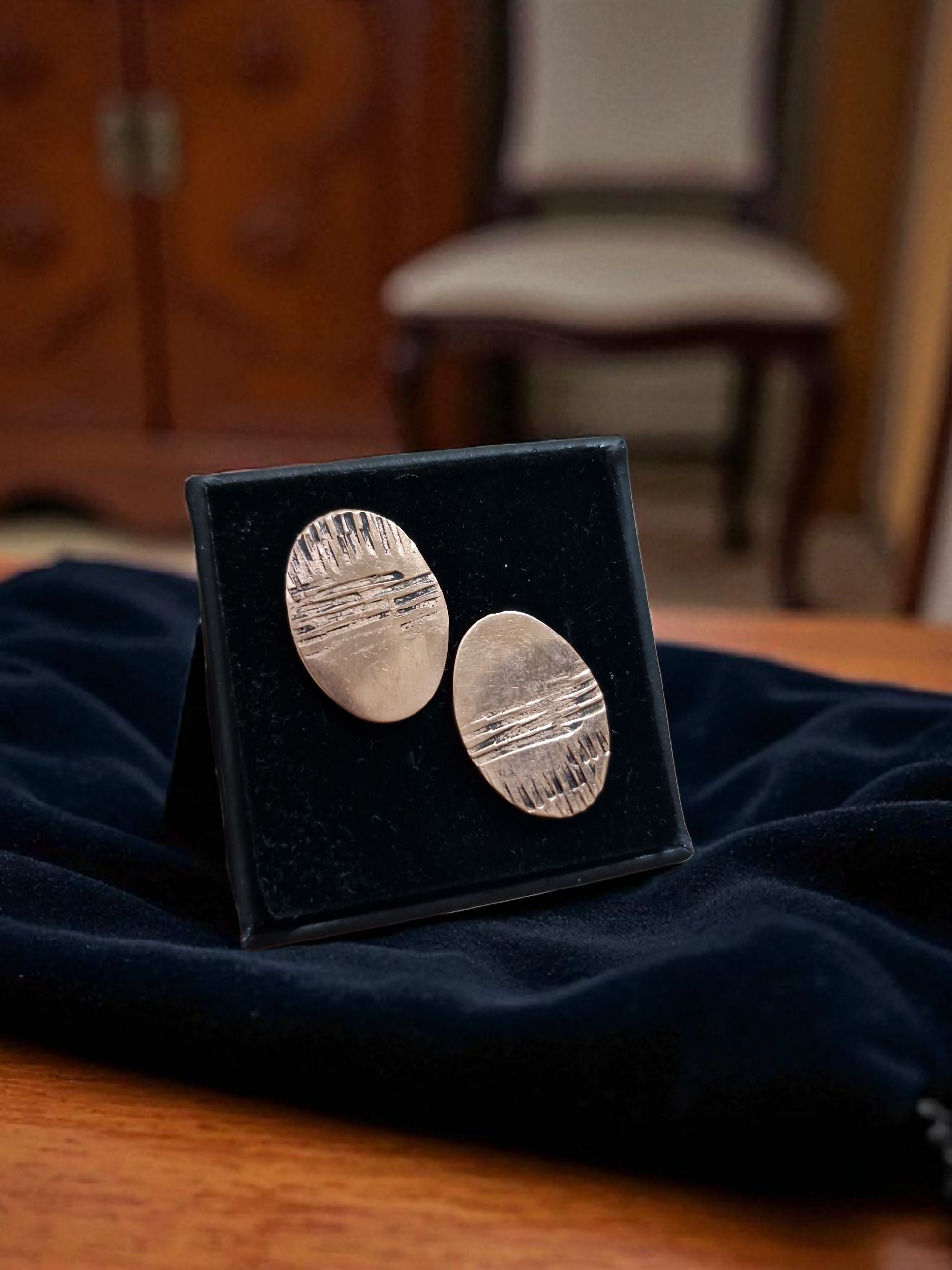 Polished copper earrings with subtle textured and oxidised detail, finished with silver posts. A timeless pair with a warm shine, perfect for everyday wear or a dressed-up look.