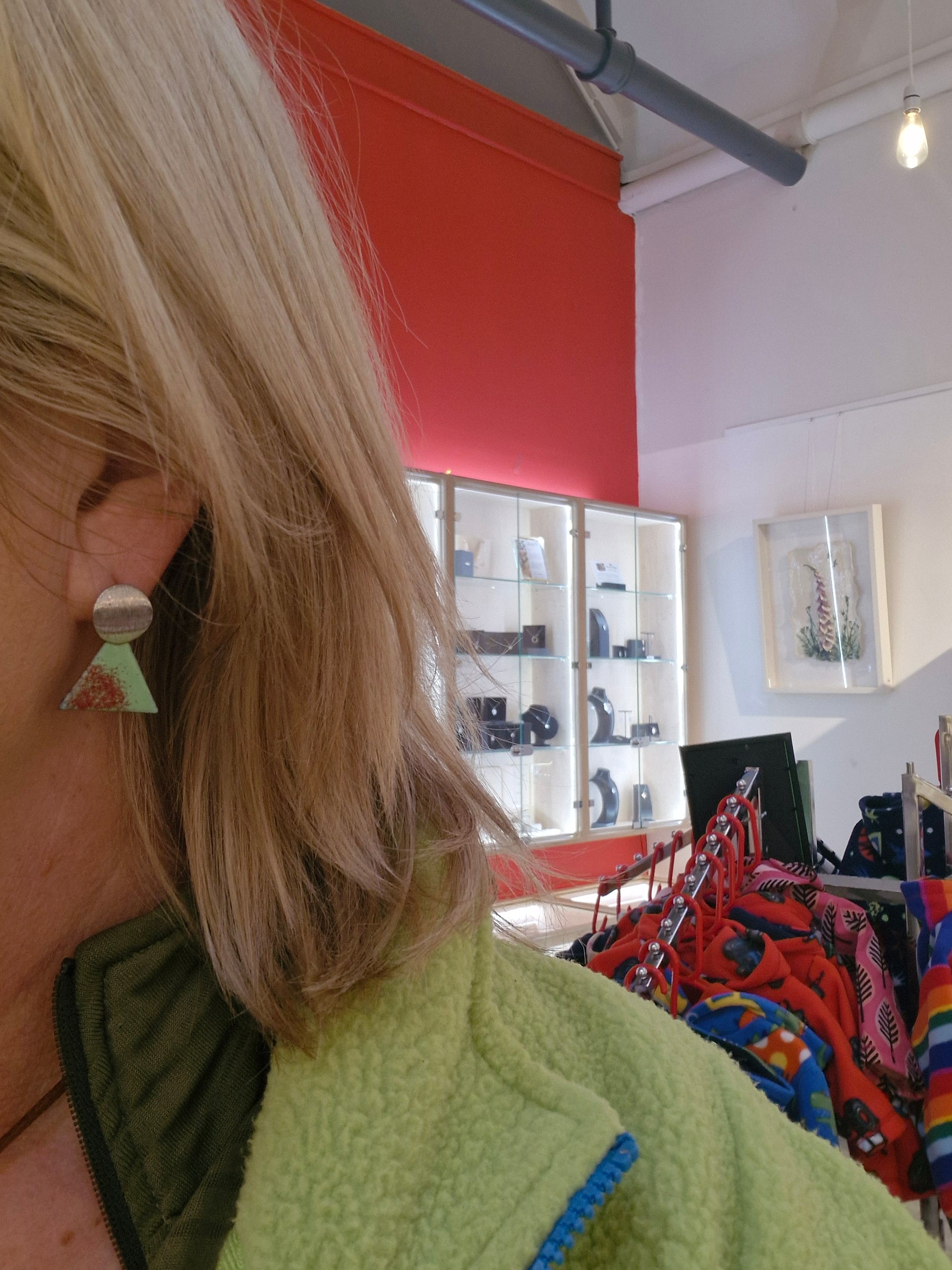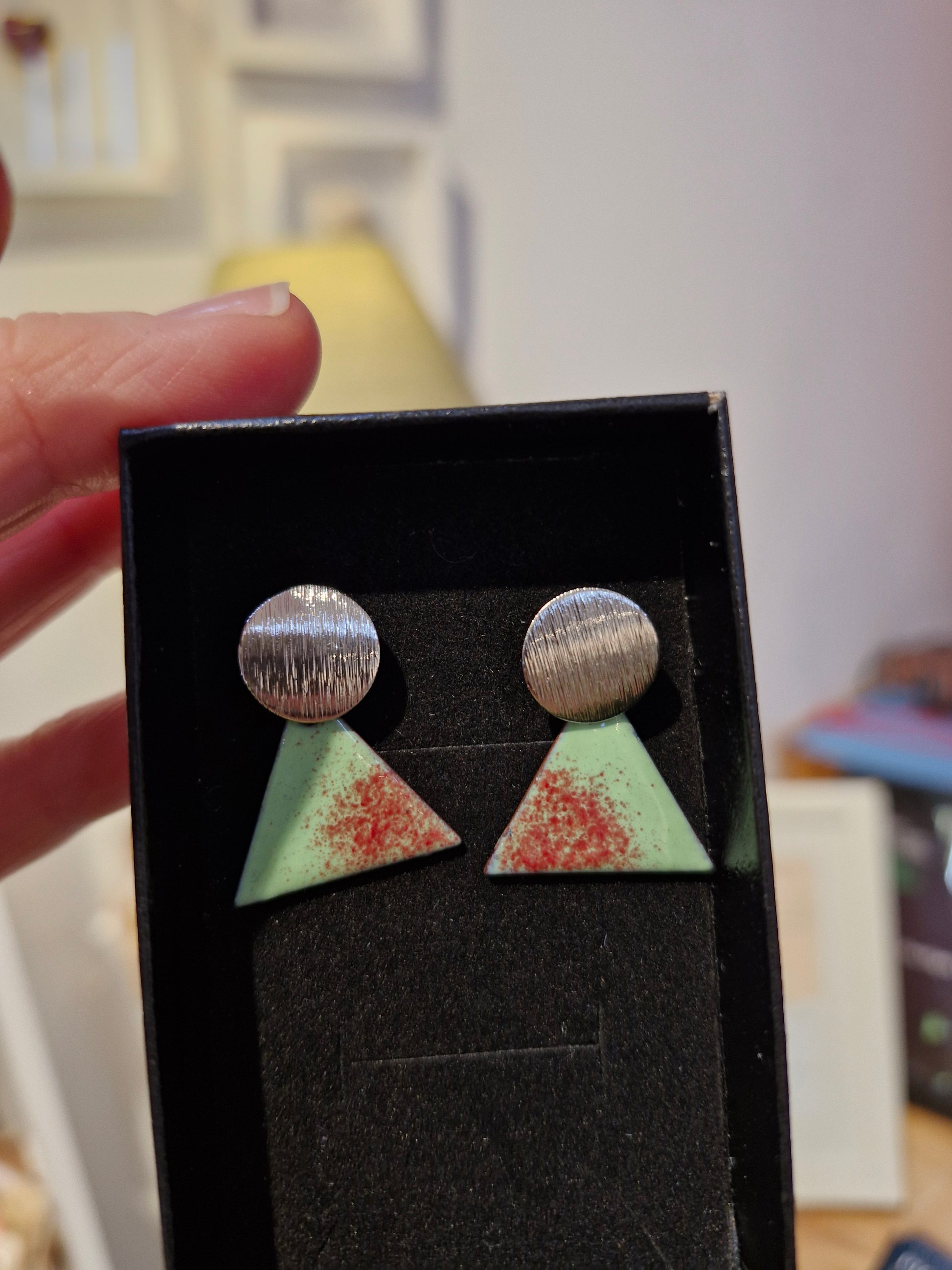Each piece is handmade in my studio in East Cork, individually designed and created, with no pair ever the same. Crafted from copper and enamel, I use hand-firing techniques to melt glass directly onto the metal, creating that rich, organic finish without the use of a kiln.