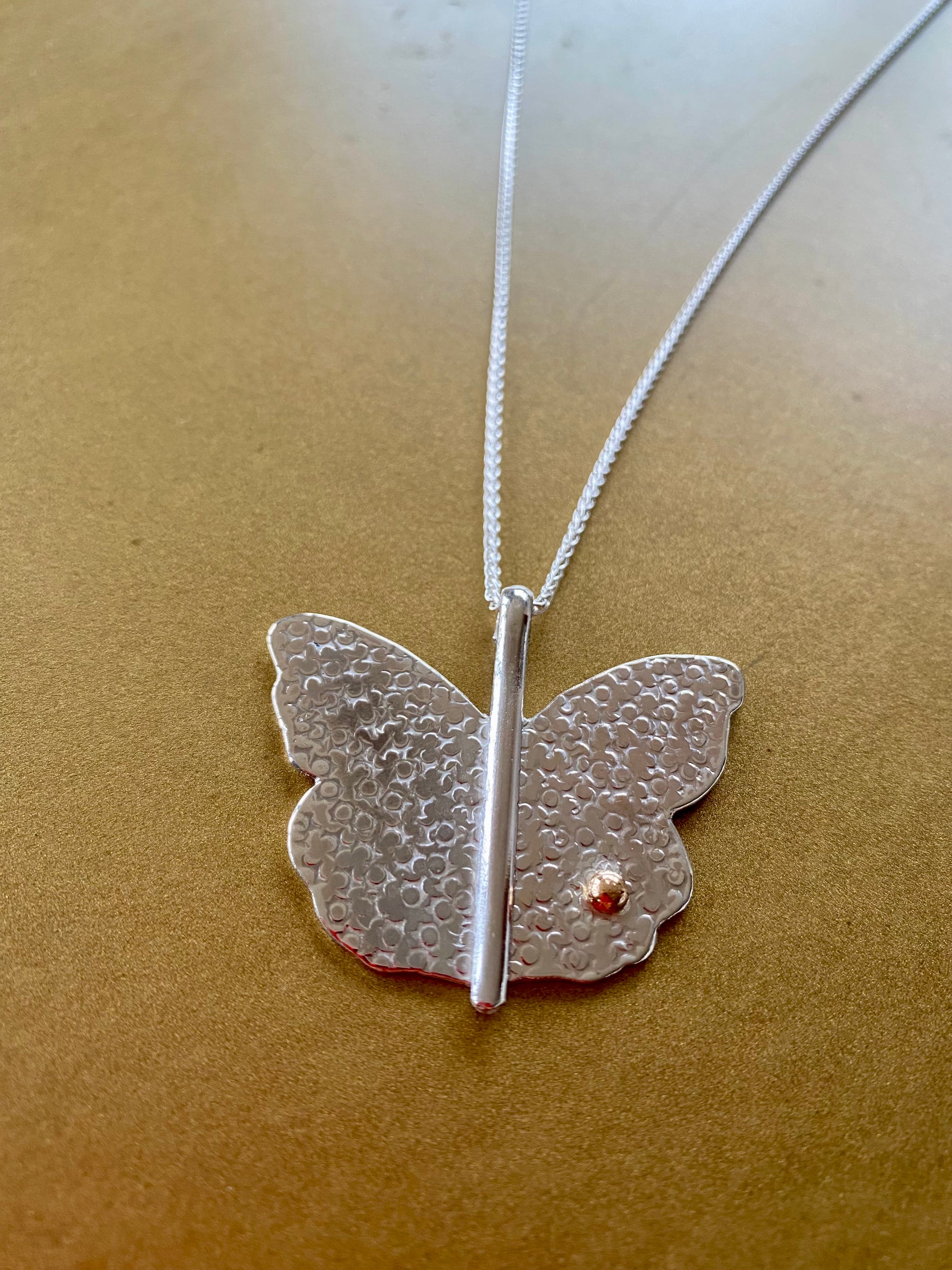 A once-off 9ct. Gold and Sterling Silver Butterfly Hand made Pendant on a Sterling Silver chain. A Symbol of Relentless Beauty.