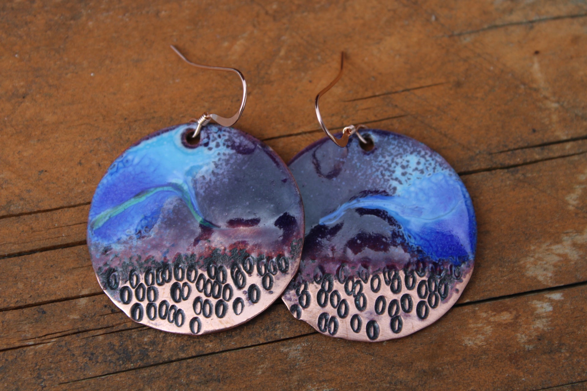 Aurora nights, the blues and purples of the Northern lights highlighted against the warmth of textured and oxidised copper discs.