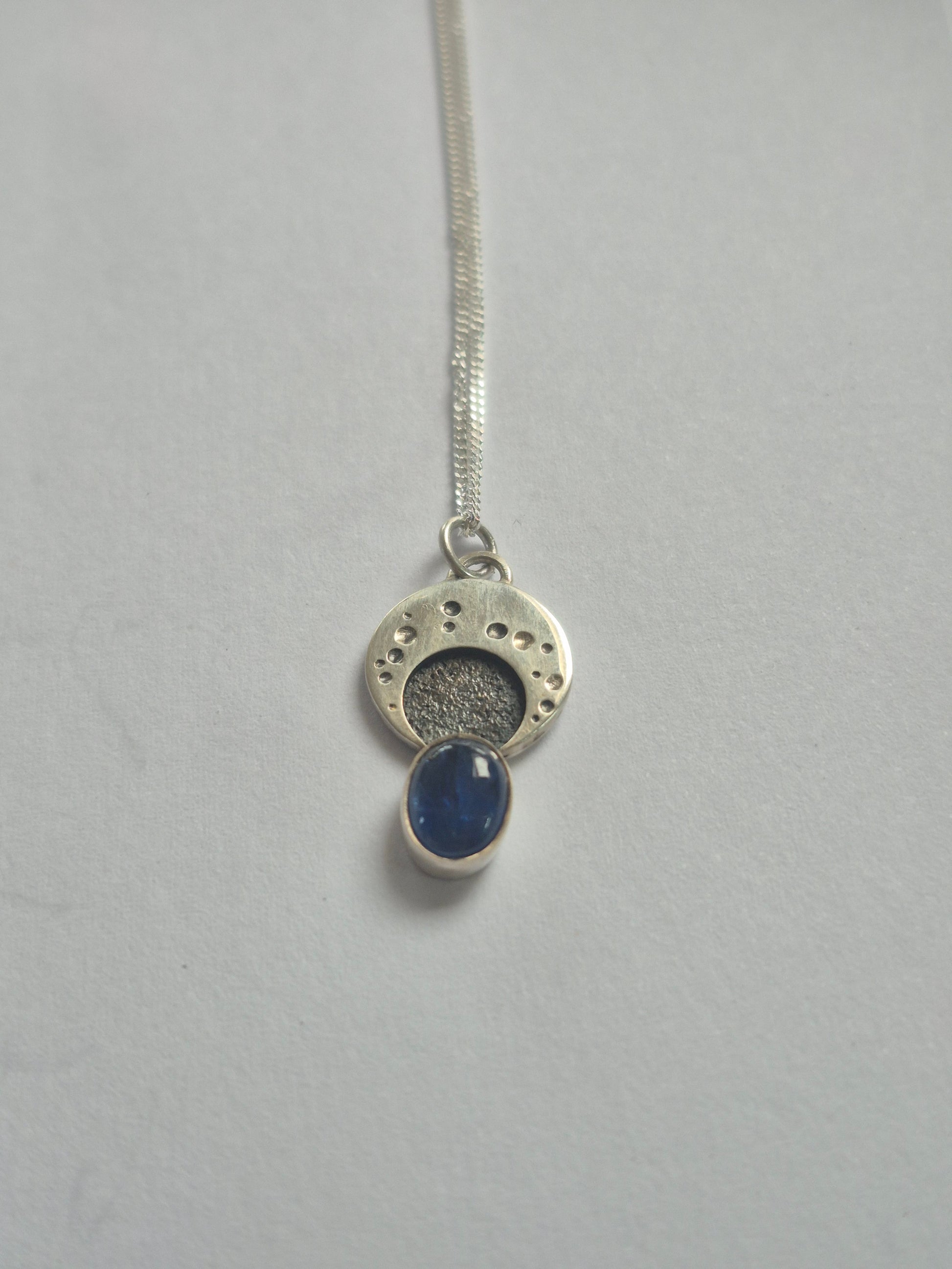 A sweet silver moon pendant featuring a glowing blue kyanite