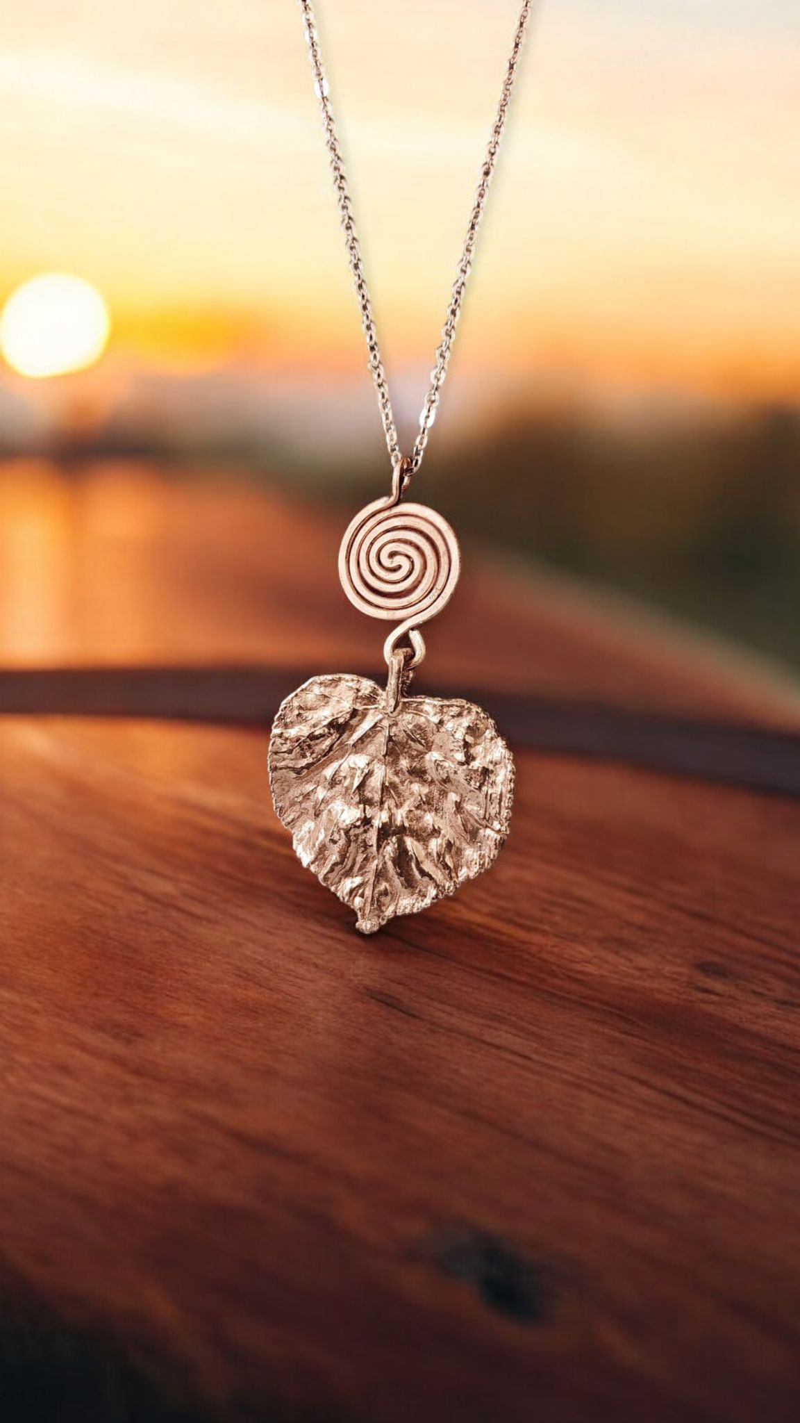 Handcrafted copper pendant made from a real linden leaf. The natural veins are perfectly preserved, and the spiral above the leaf symbolizes harmony and the eternal flow of life.