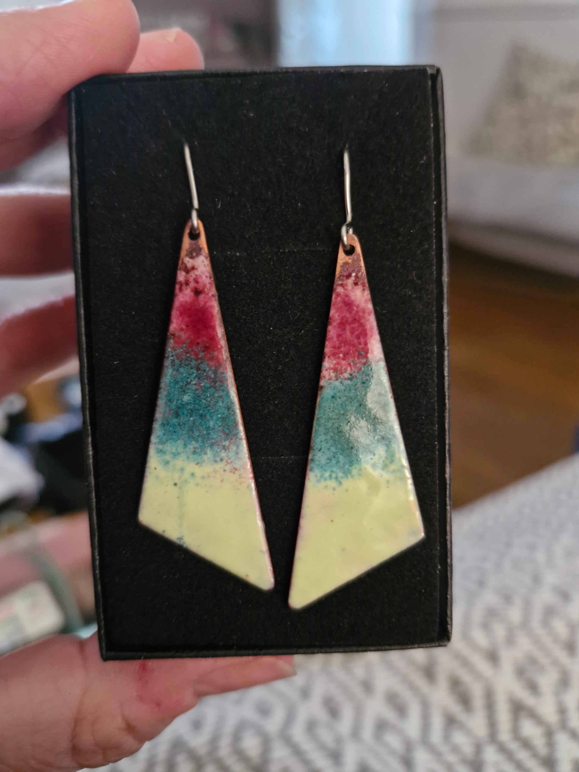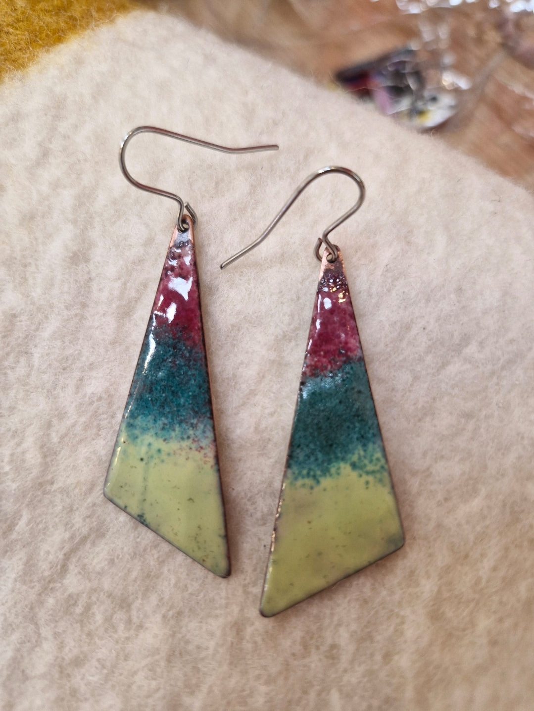 Like the meeting of sky and earth at dawn, Wild Horizon carries the colours of untamed landscapes — berry dusk, ocean teal, and soft sunlit yellow. Each enamelled shard is fired on copper, alive with texture and shifting tones, so no two are ever the same. A bold, boho statement piece, wearable art that holds the wild horizon close.