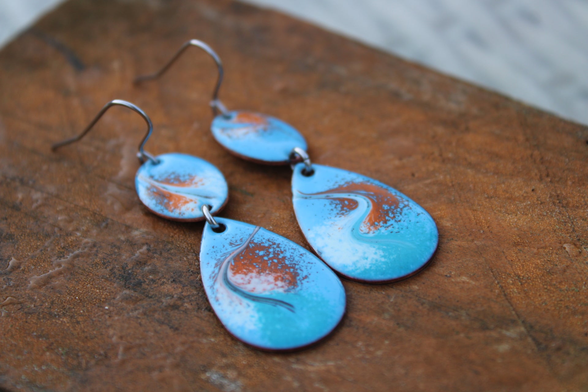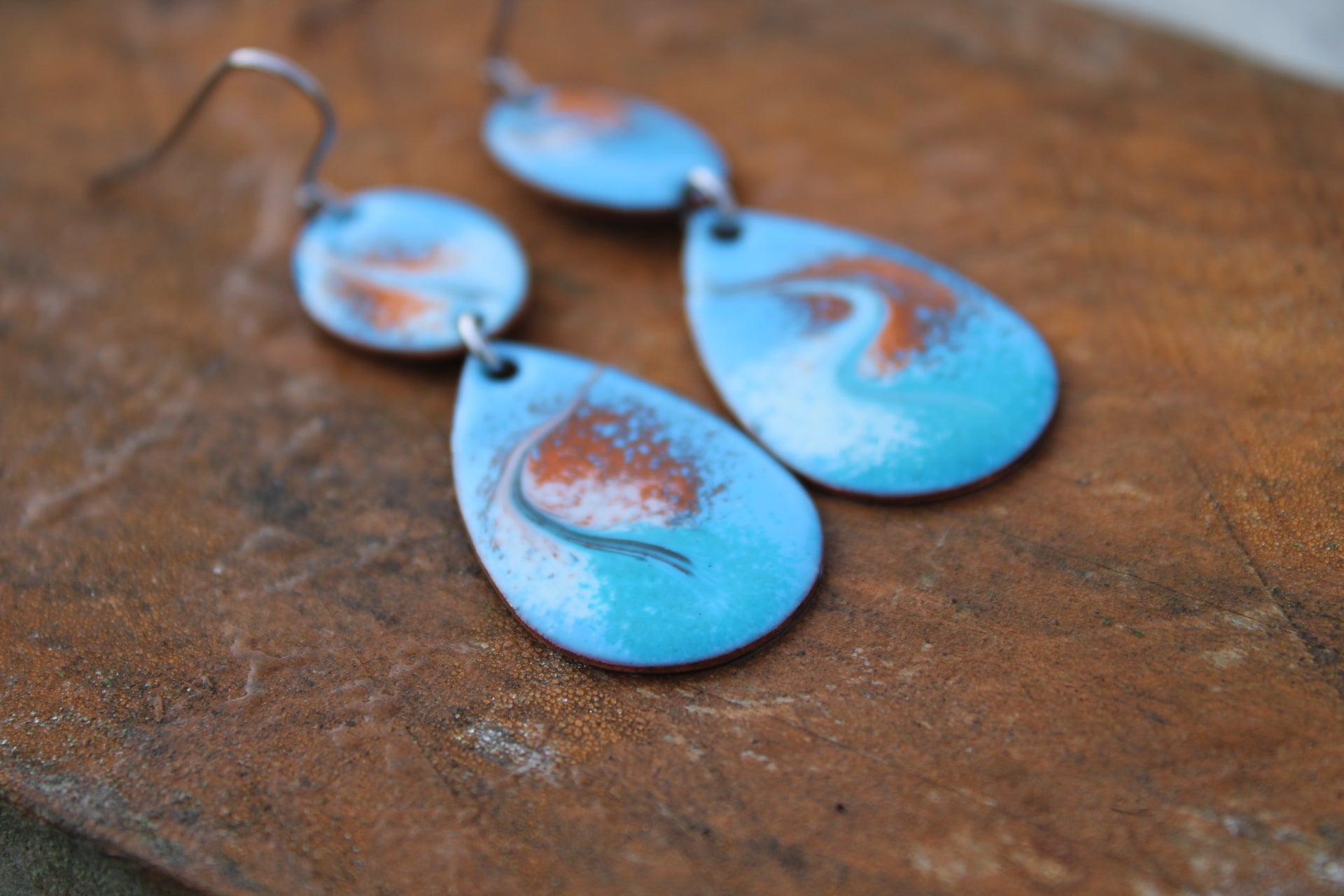 Handmade enamel earrings, artisan copper jewellery, ocean inspired earrings, turquoise and copper statement earrings, teardrop enamel earrings, sustainable handmade jewellery.