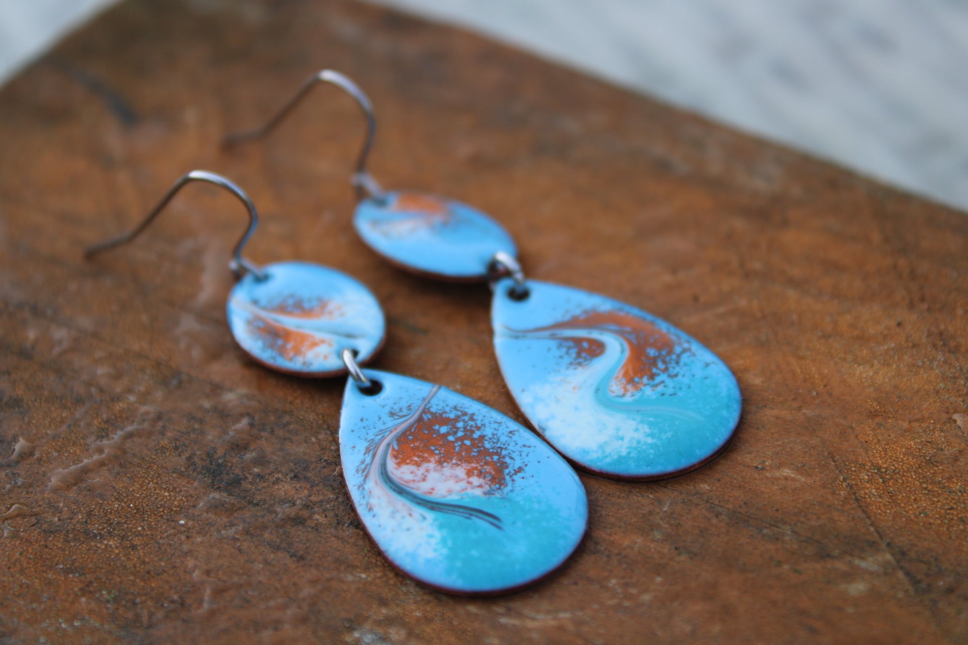 Handmade enamel earrings with rich ocean blue, warm copper tones, and soft white sweeps that echo the movement of water. The double-drop design combines a rounded top with a teardrop below, giving balance and flow while remaining lightweight and comfortable. Crafted by hand in copper and enamel, Tide is a striking statement piece — bold, modern, and inspired by the shifting shoreline.
