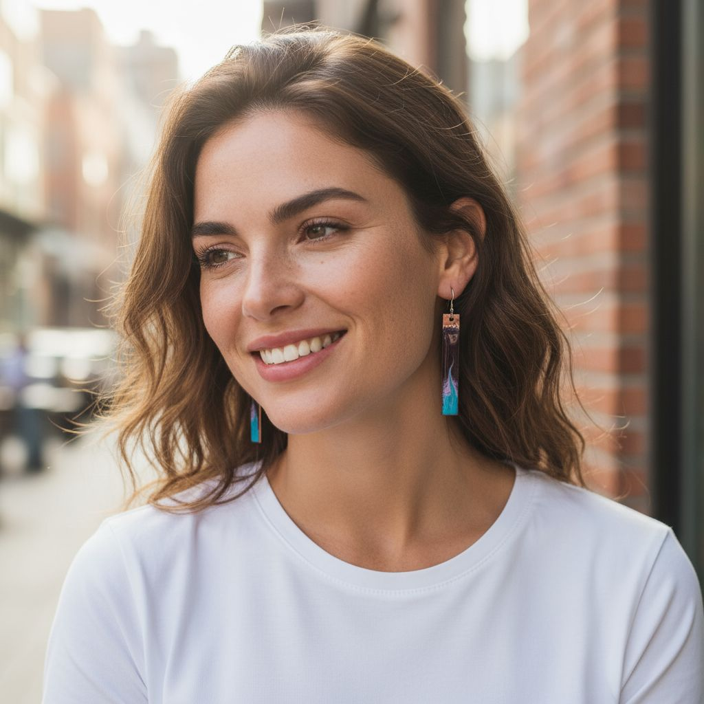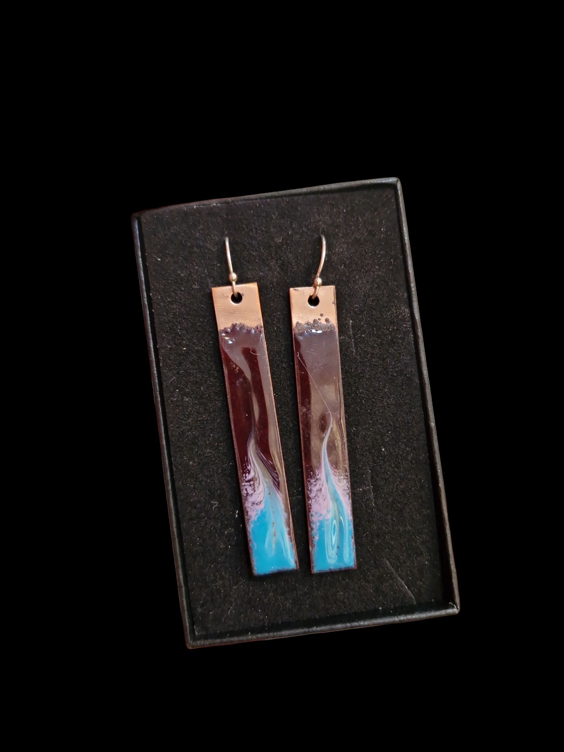 A flowing ribbon of burgundy sweeps into soft sky-blue, edged with pale drift-white — a painterly swirl that feels both bold and fluid. Set on warm copper, these earrings echo the season’s colours, rich as autumn berries and alive with movement, like wine swirling in the glass or waves turning on the shore.