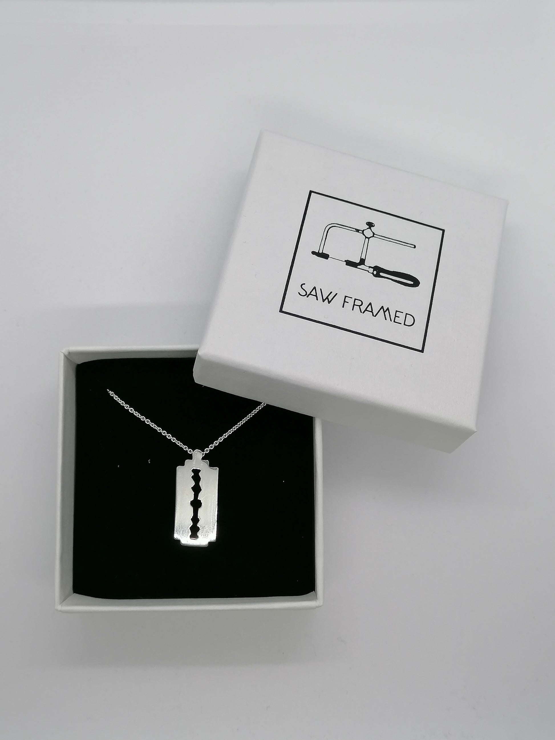 Handmade solid sterling silver unisex razor blade necklace, comes with standard 18 inch chain and a branded box.