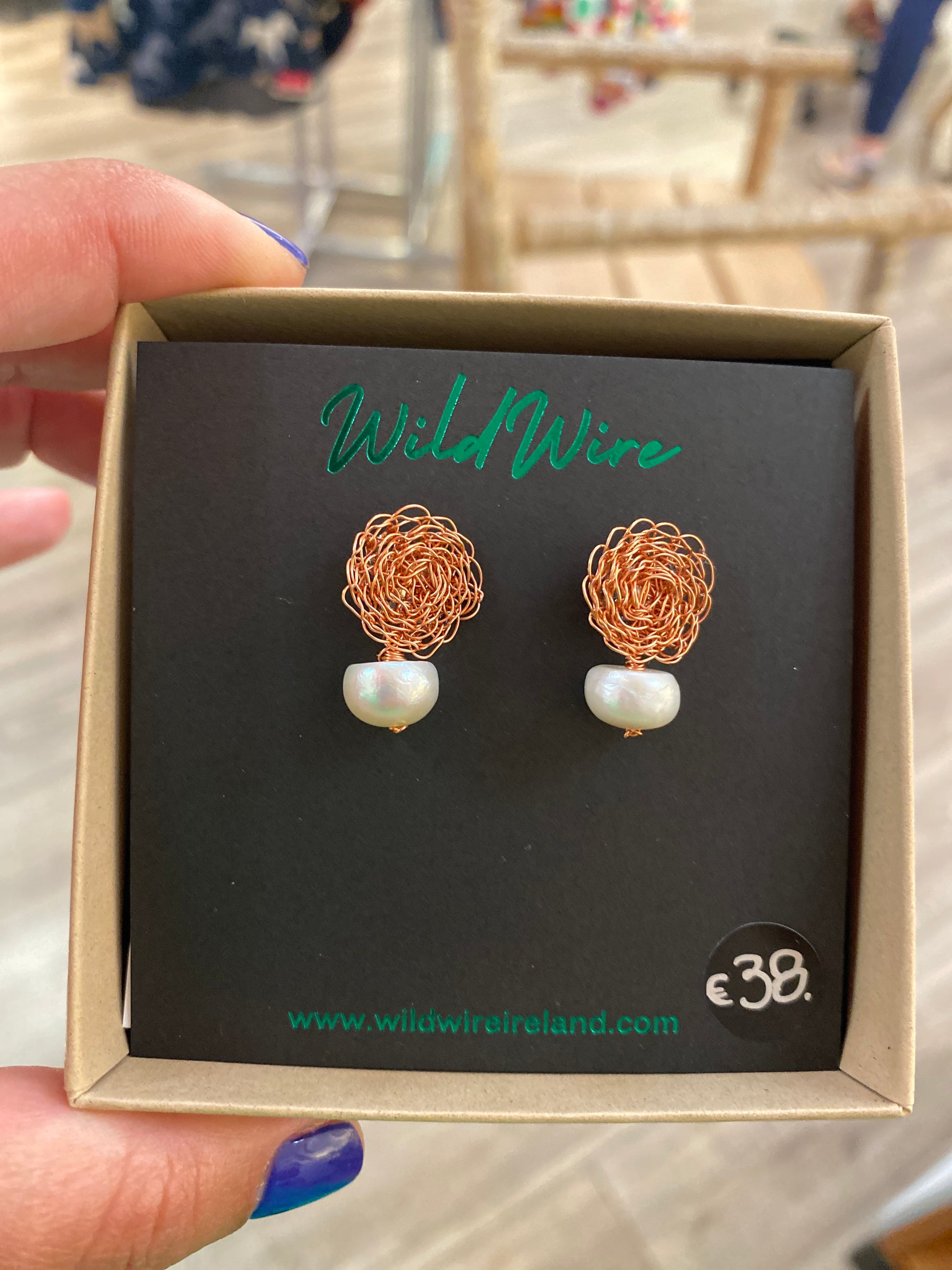 Our Oola Earrings offer timeless beauty with dainty elegance. Handcrafted from a copper-plated wire in the shape of a rose, each earring features a classic freshwater pearl.