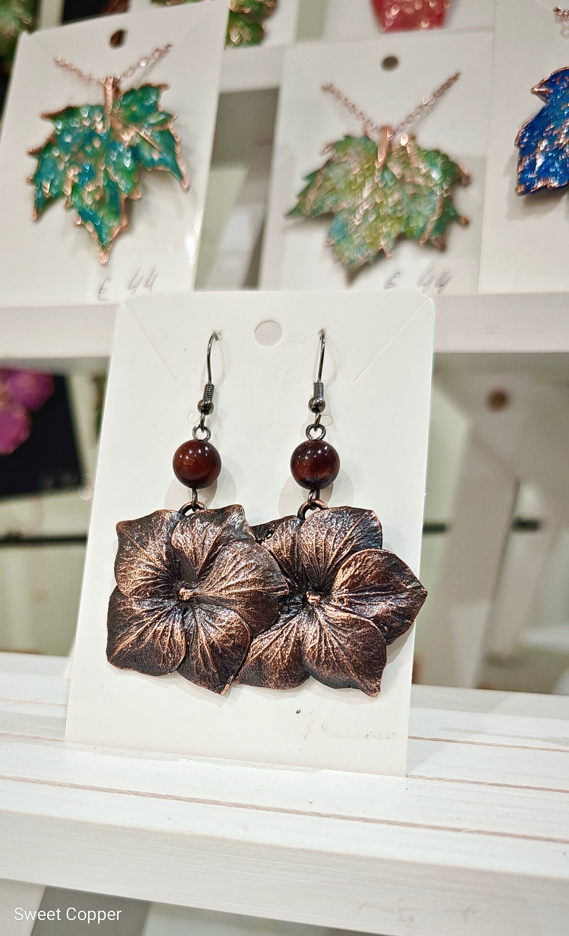 Elegant handcrafted jewellery set made from real hydrangea flowers, electroformed in copper with a classic patina that gives each petal a warm evening glow.
