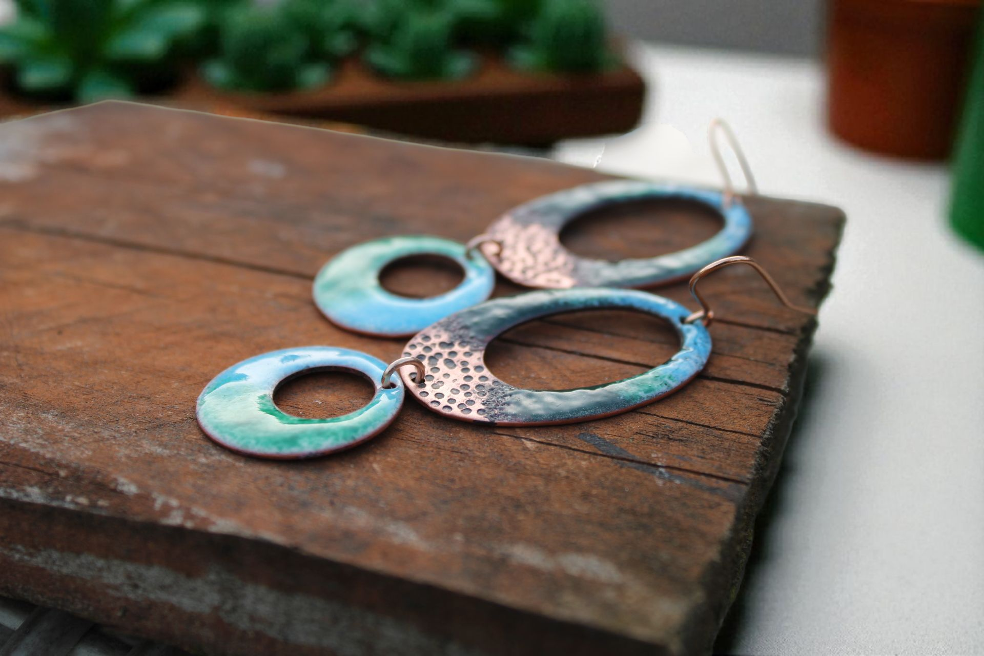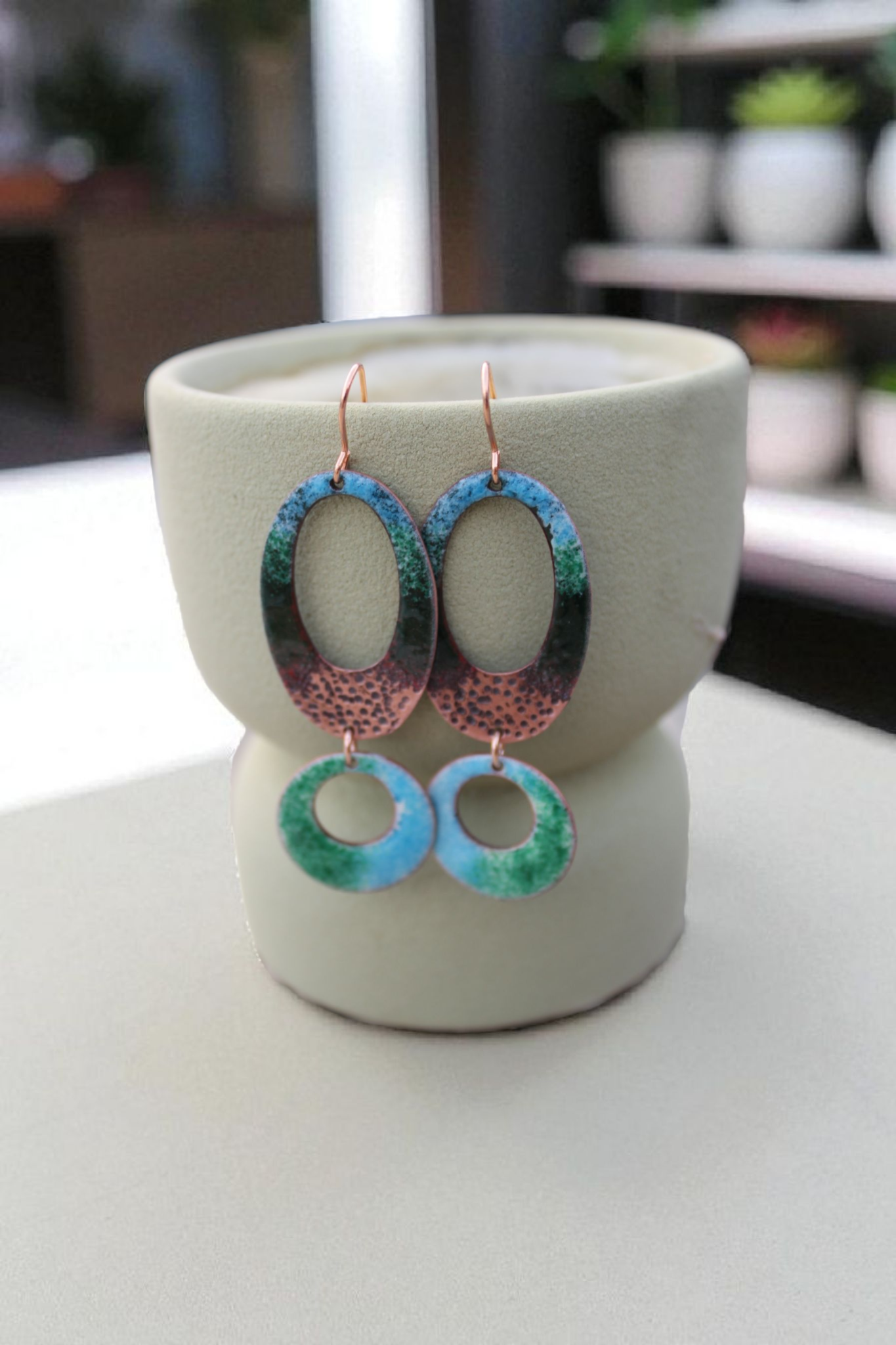 Like tidal pools left shimmering in the rocks, Shoreline Echo earrings hold the colours of sea and stone — turquoise, green, and deep ocean blue blending against hammered copper.