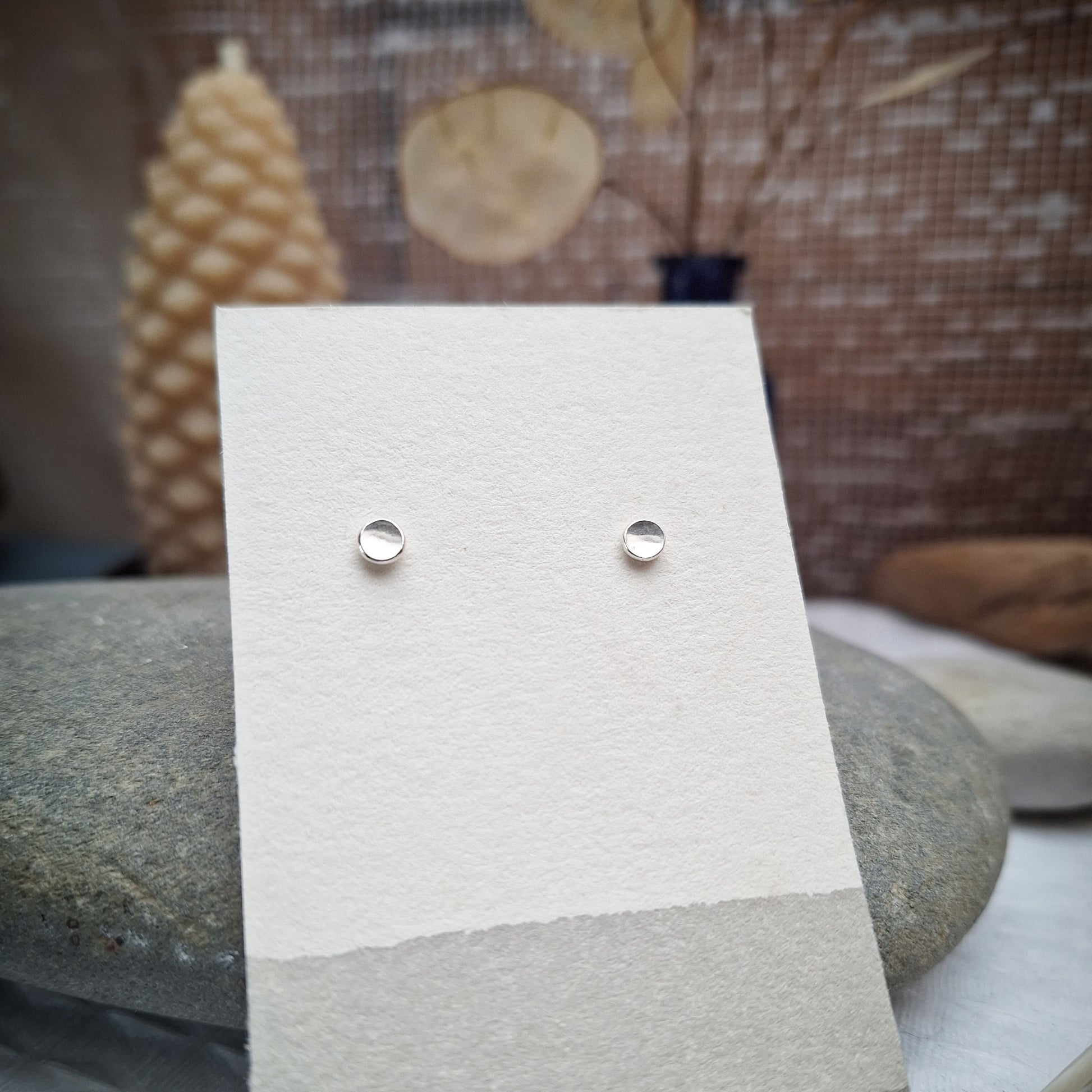 Dainty little silver studs made from sterling silver. Made by melting and hammering, each earring has a unique organic shape. Delicately domed into a concave shape to reflect the light.