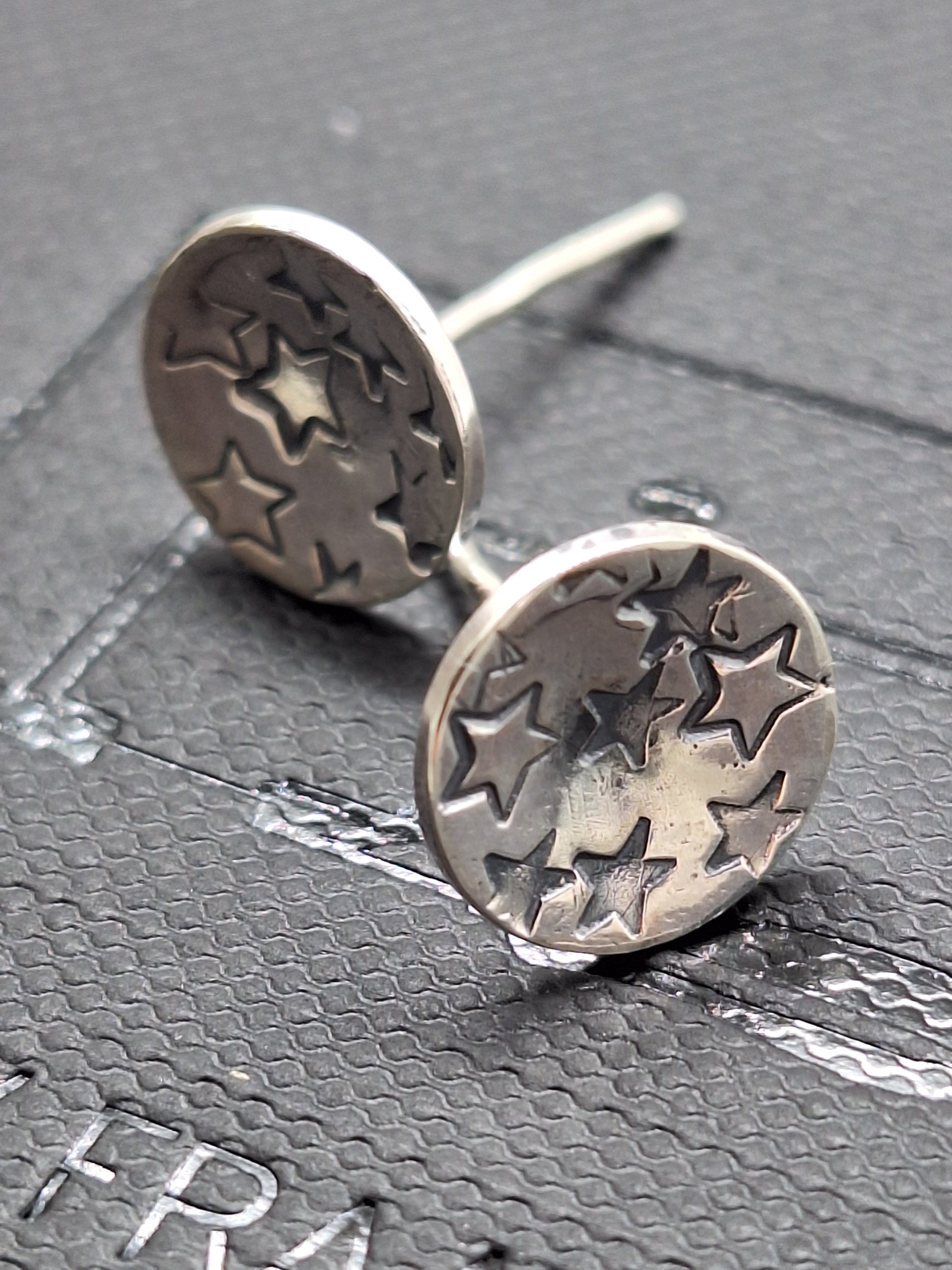 Handmade sterling silver round slight domed earrings studs with oxidised star details.