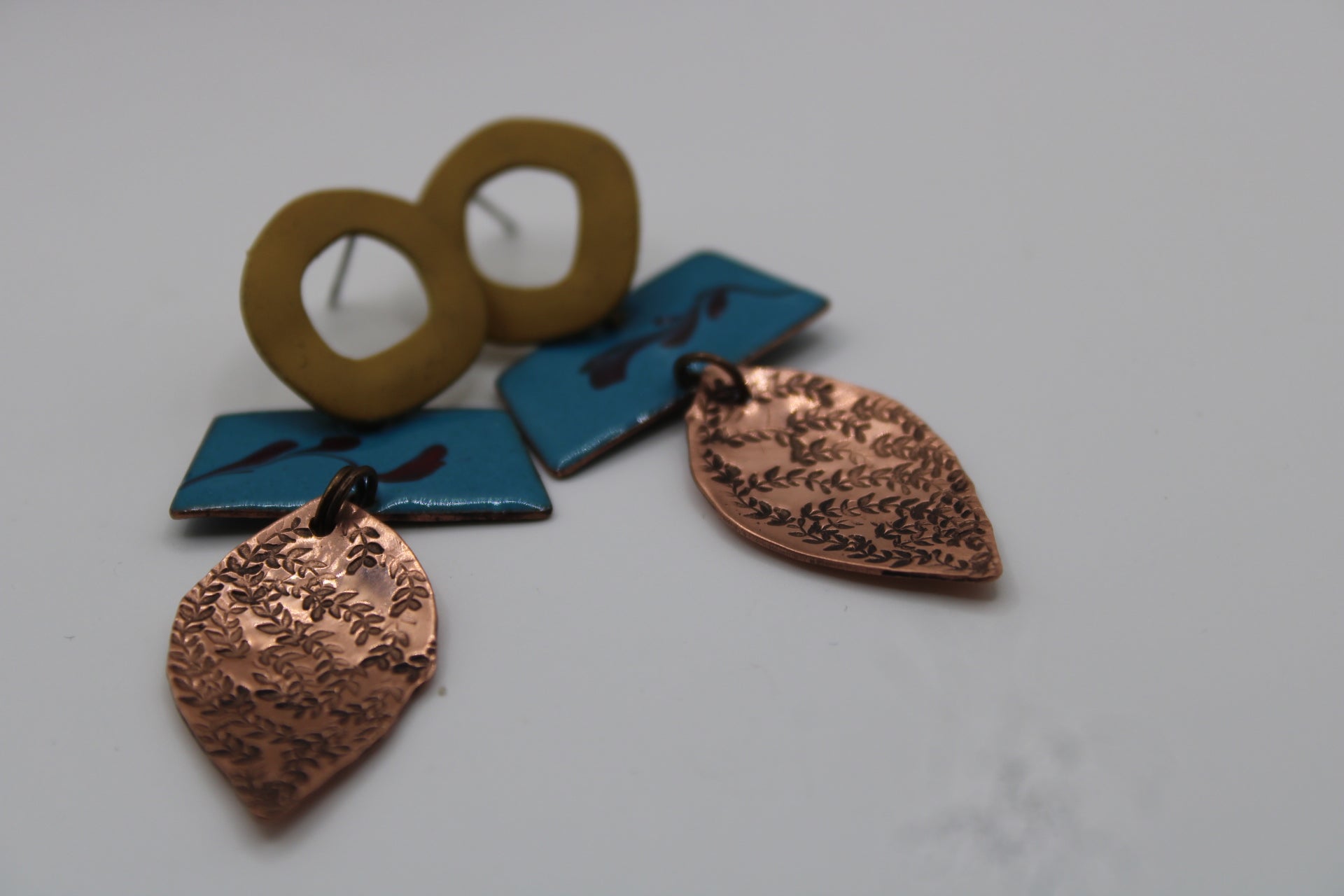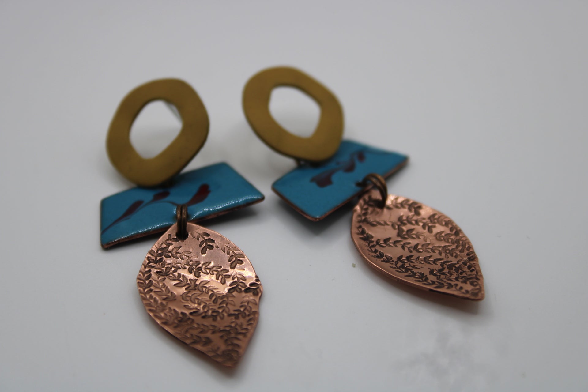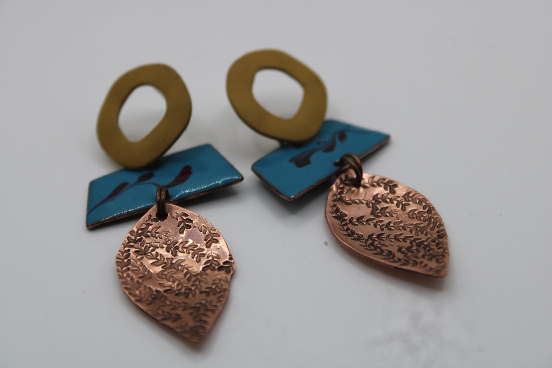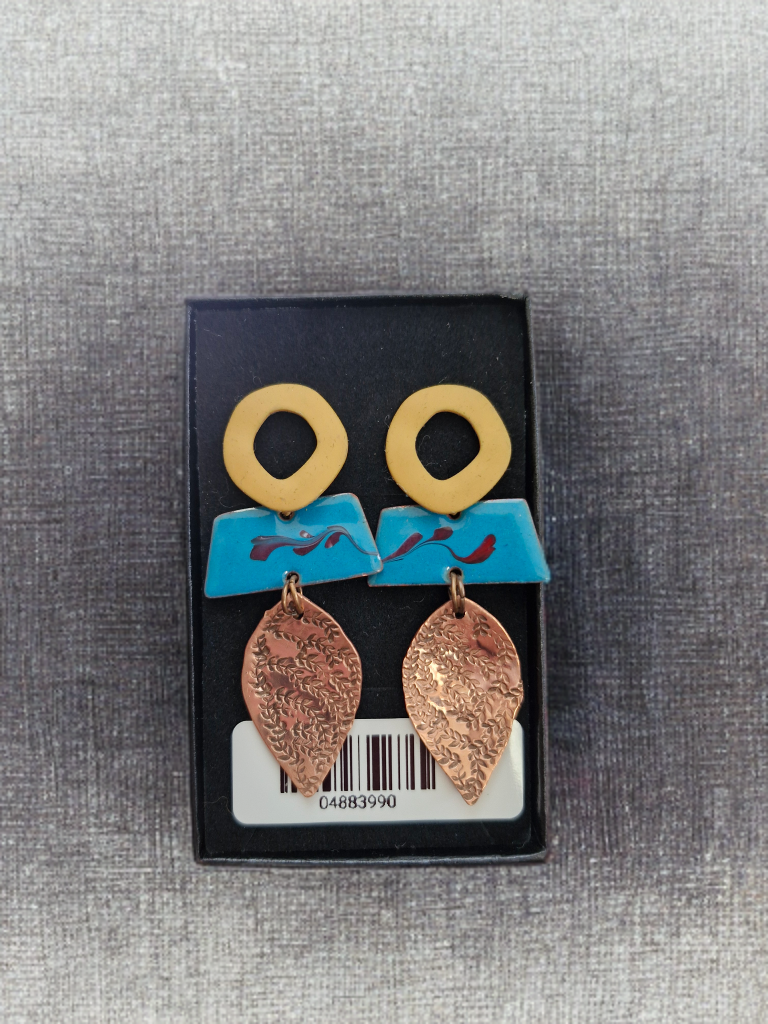 Handmade in my studio in East Cork, each piece is individually designed and created — no pair ever the same. Crafted from copper and enamel, I use hand-firing techniques to melt glass directly onto the metal, creating a rich, organic finish without the use of a kiln.