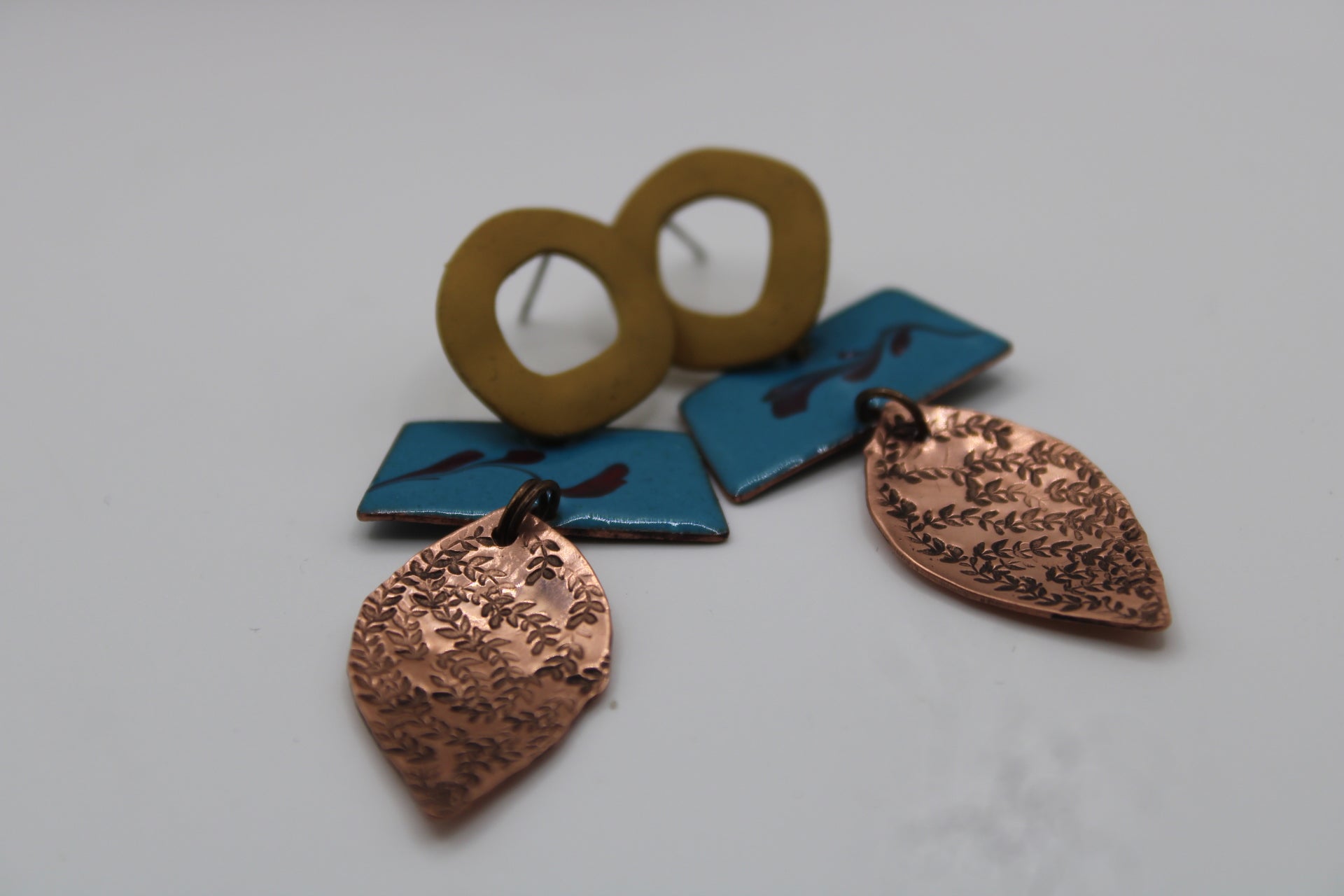 Sunfall balances form, texture, and colour in a bold, graphic composition. A mustard silicone-covered ring with a stud anchors the design. Beneath it, a hand-cut turquoise enamel bar bears a single inky red fleck, while a shiny, hammered copper leaf completes the 5.5cm drop with movement and depth.