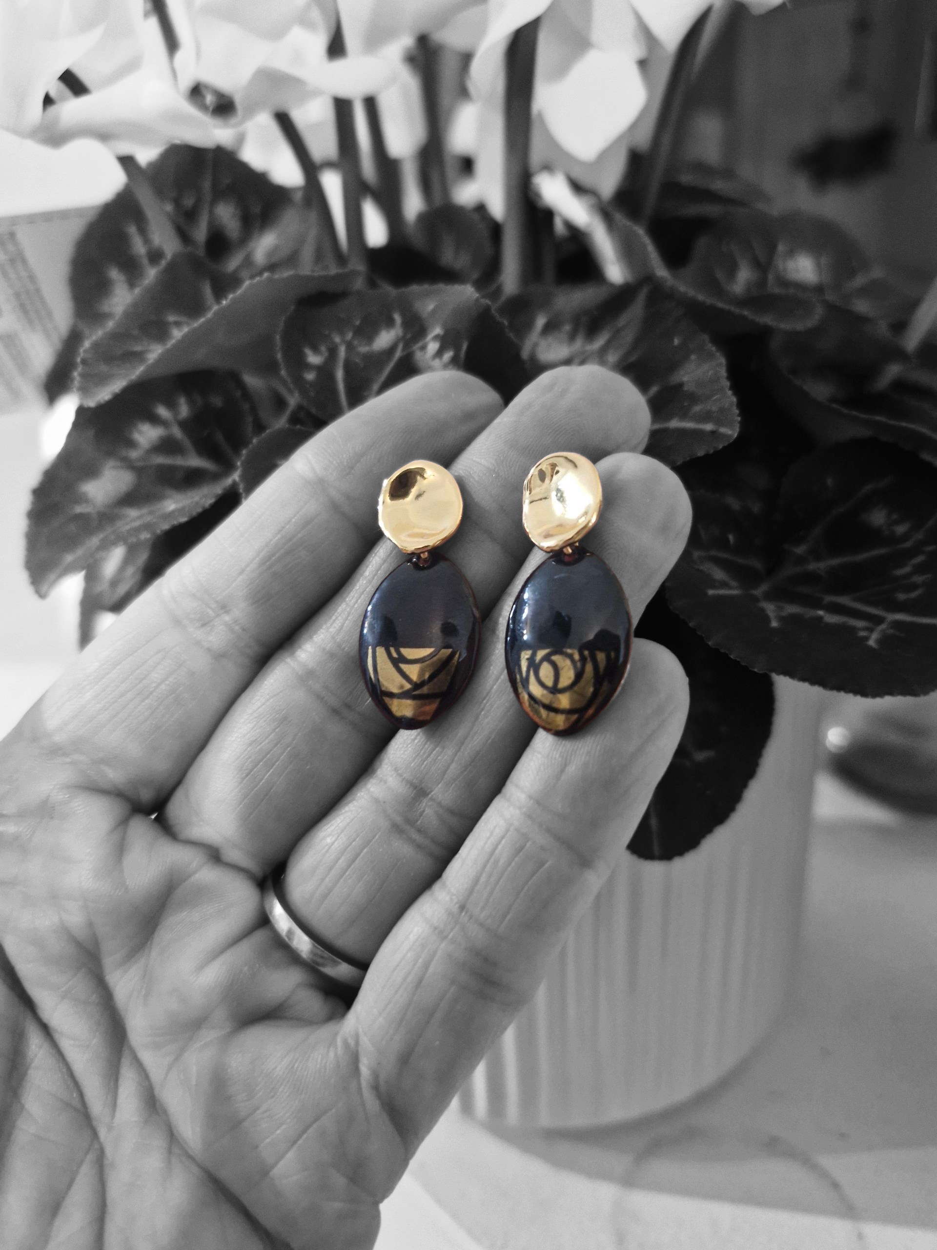 Each earring is handmade in my East Cork studio — individually designed, hand-fired enamel over copper, no kiln, just flame and intuition. No two pieces ever the same, always one-of-a-kind.