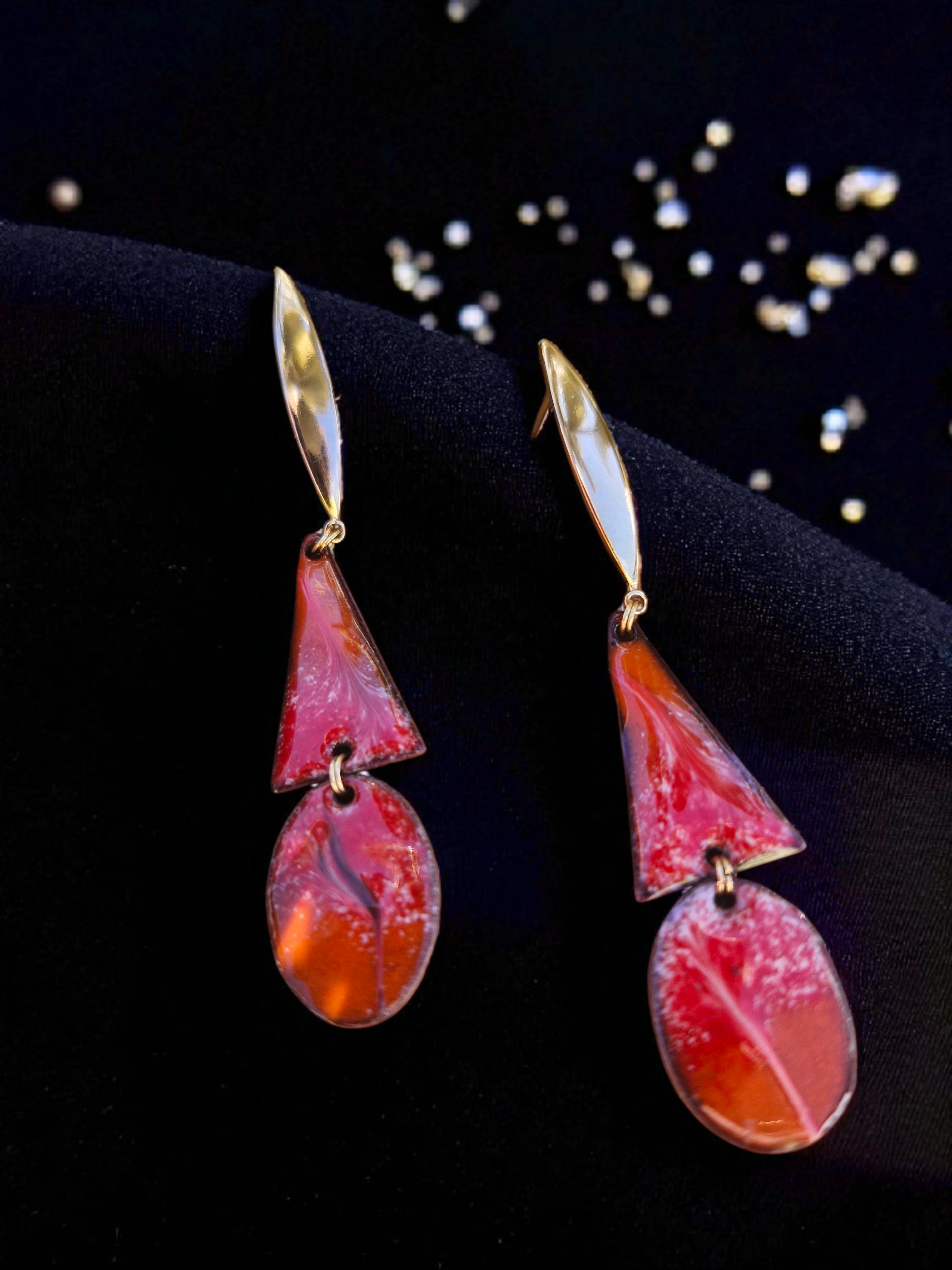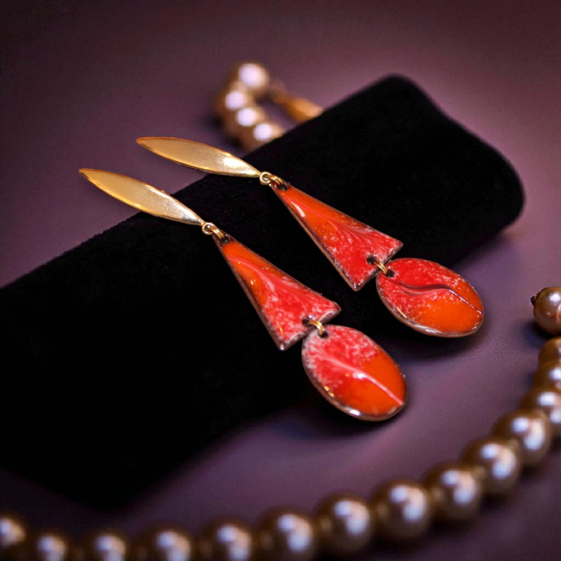 Drenched in molten red and orange enamel and set against a golden gleam , these earrings are made for nights that stretch beyond the twilight. Bold yet elegant their fluid shapes catch the light like candle flames.