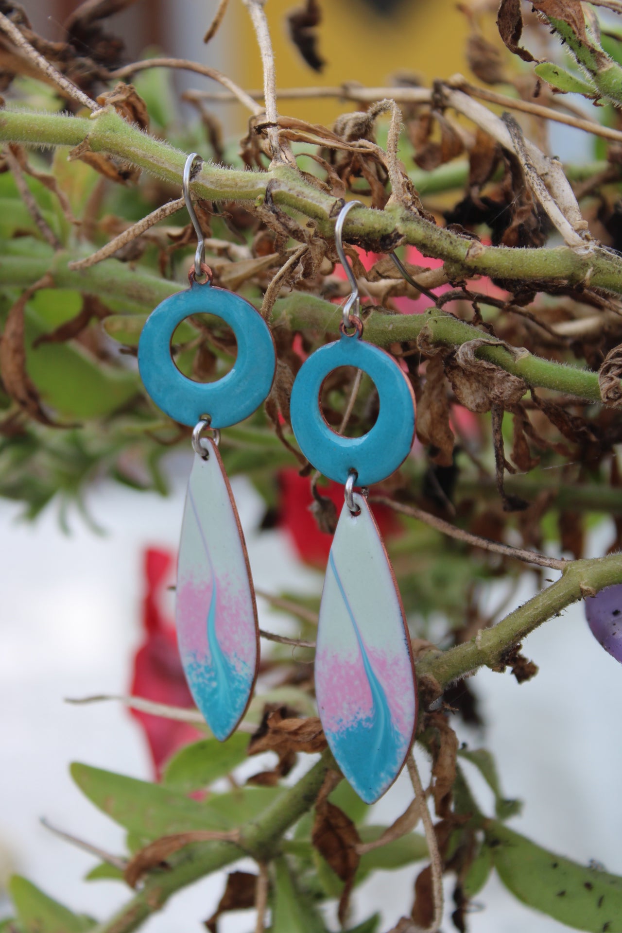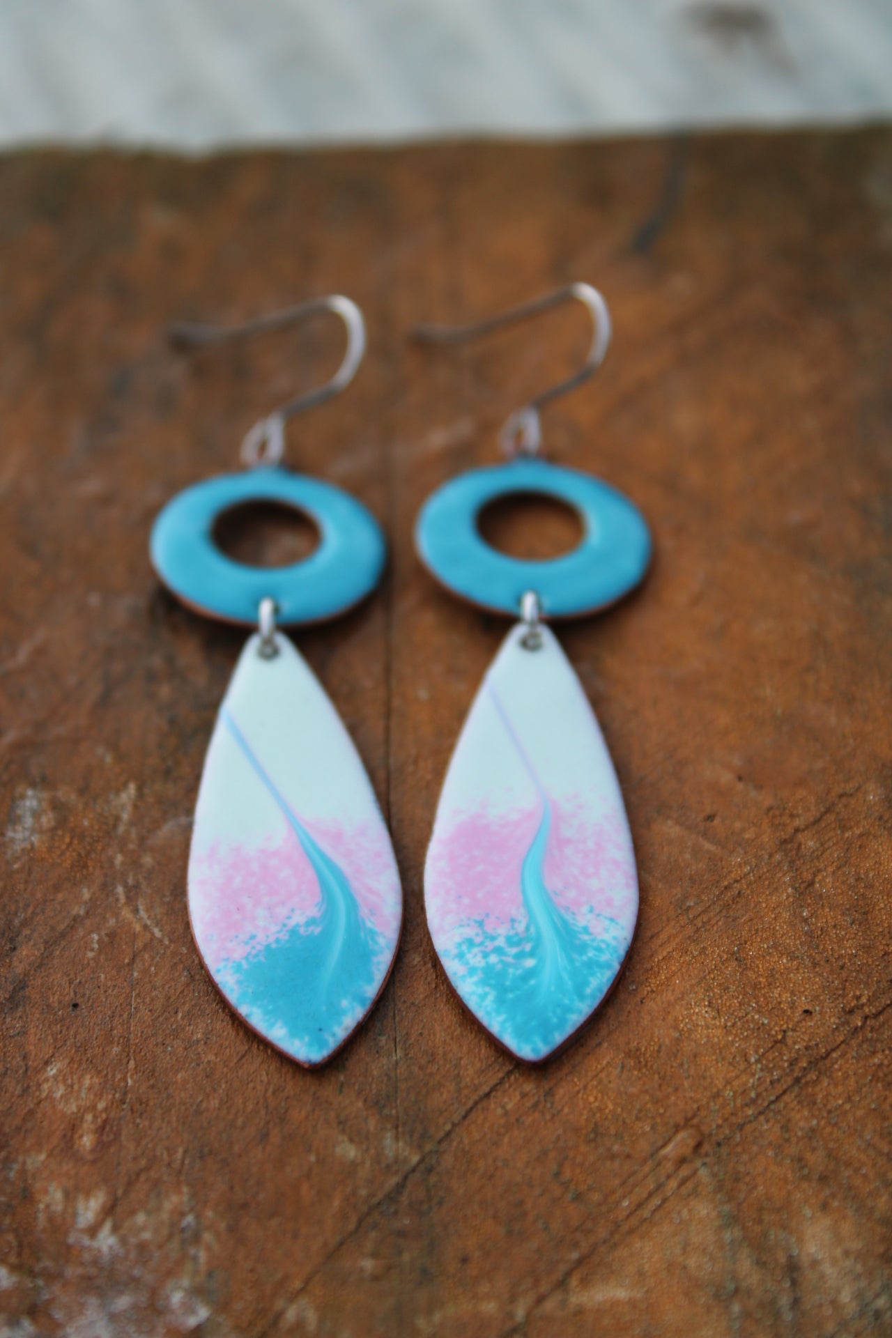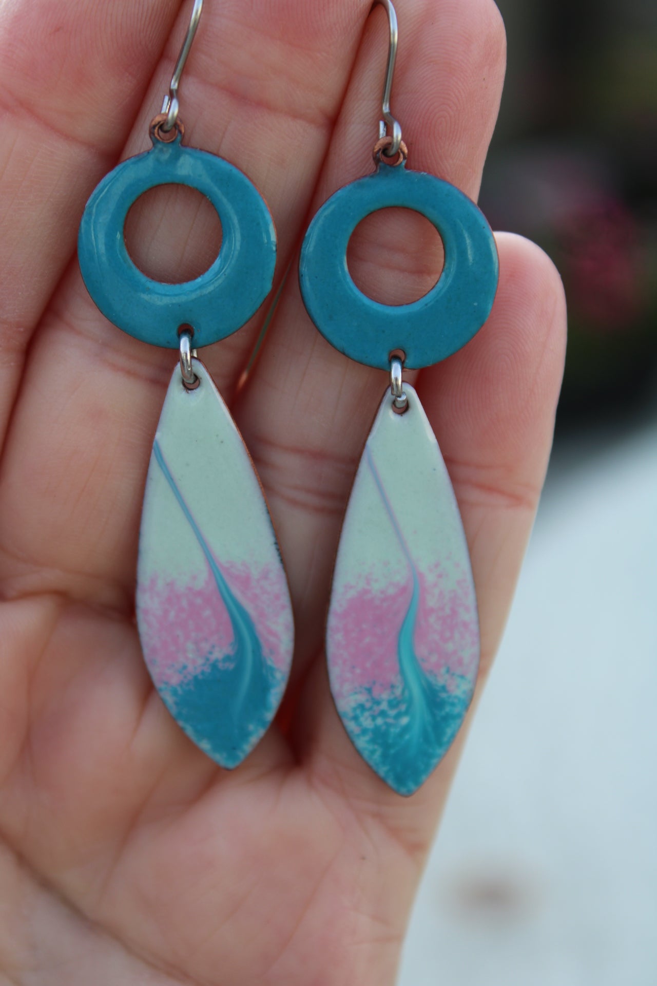 Handmade enamel earrings in bold turquoise with soft blends of pink, white, and blue.