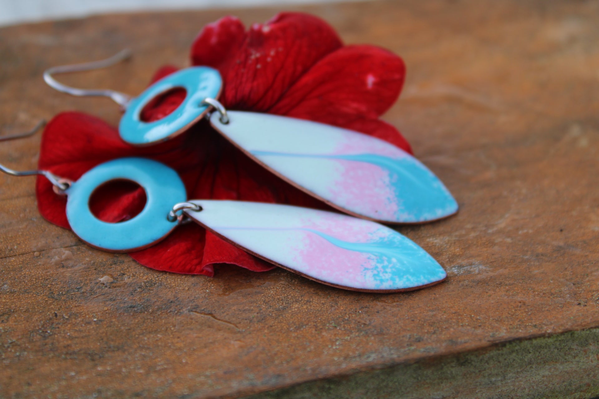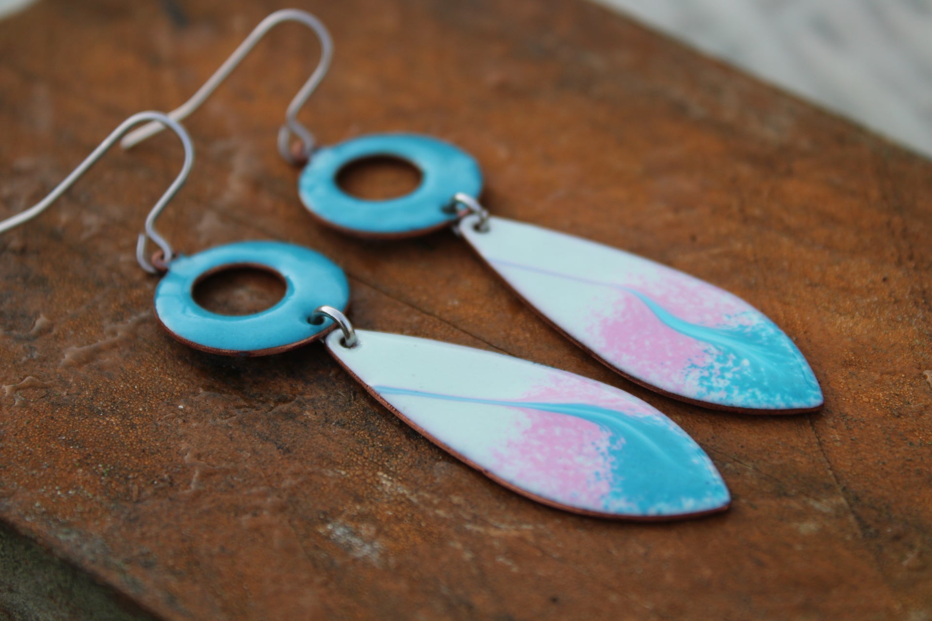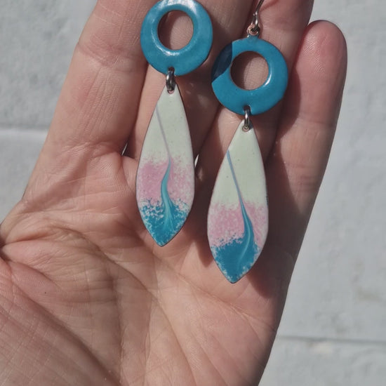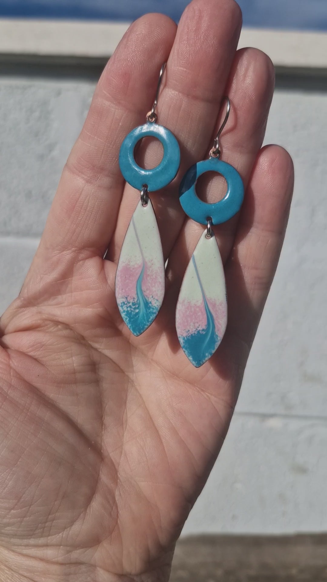 Handmade enamel earrings in bold turquoise with soft blends of pink, white, and blue.