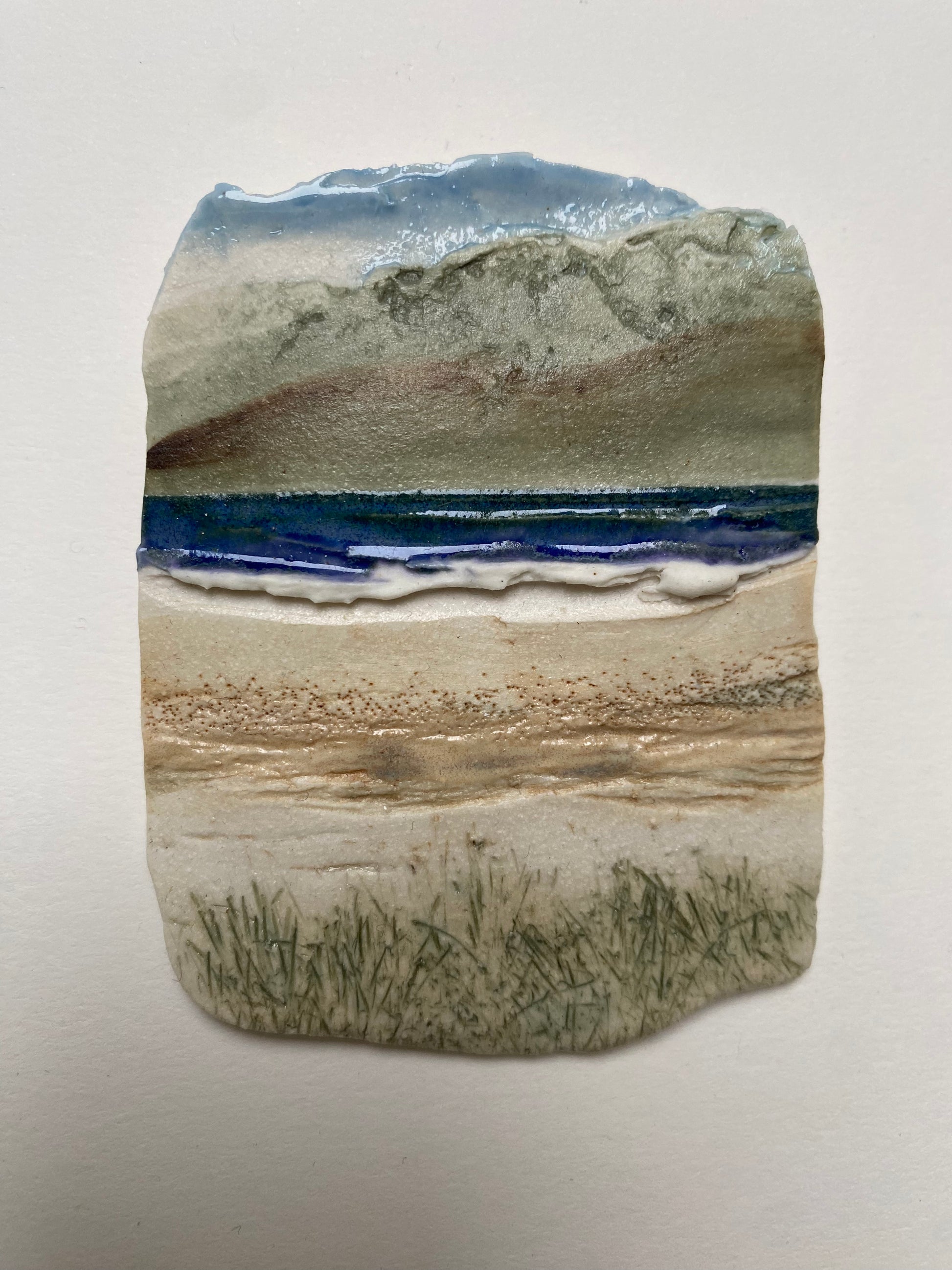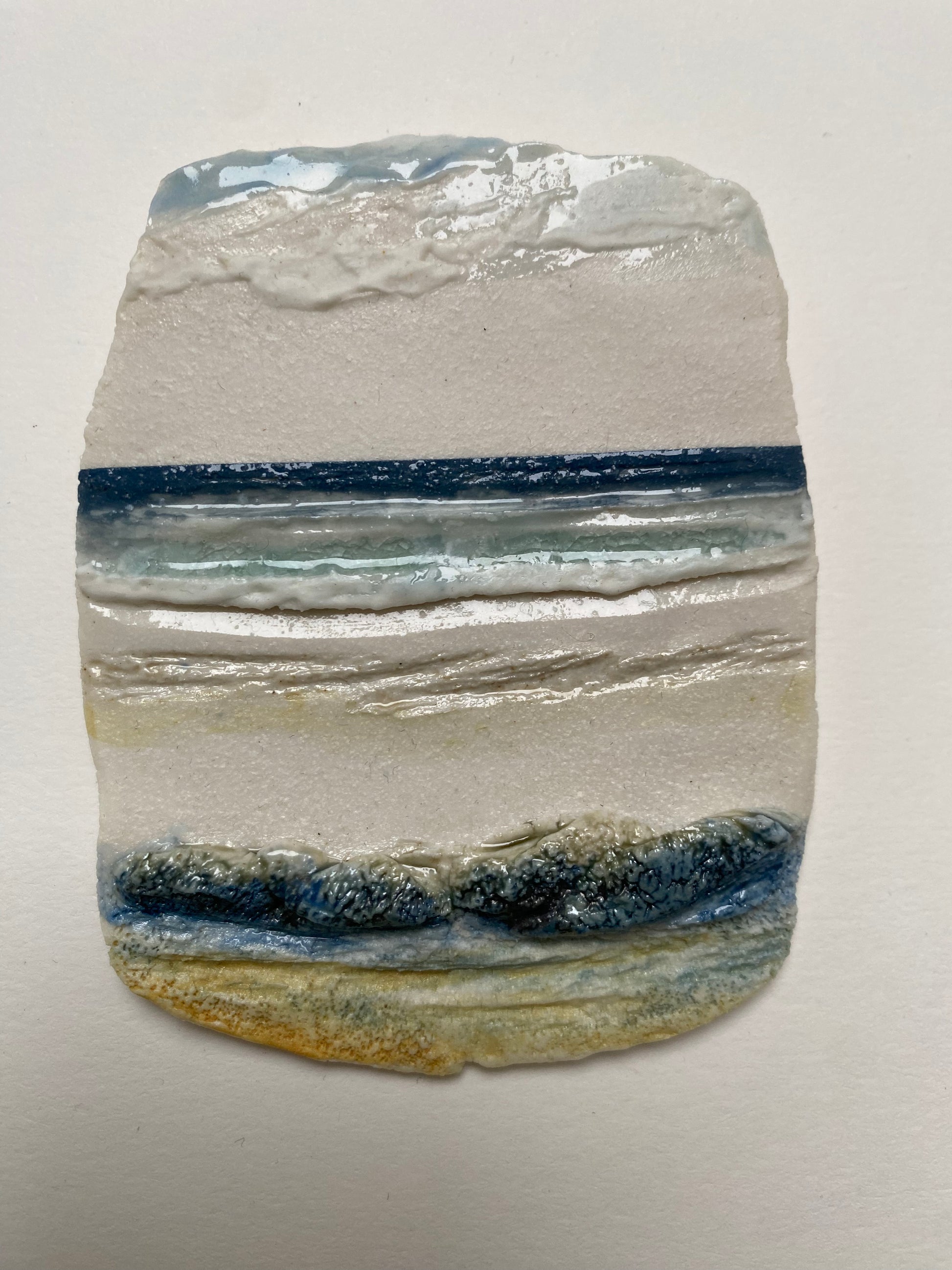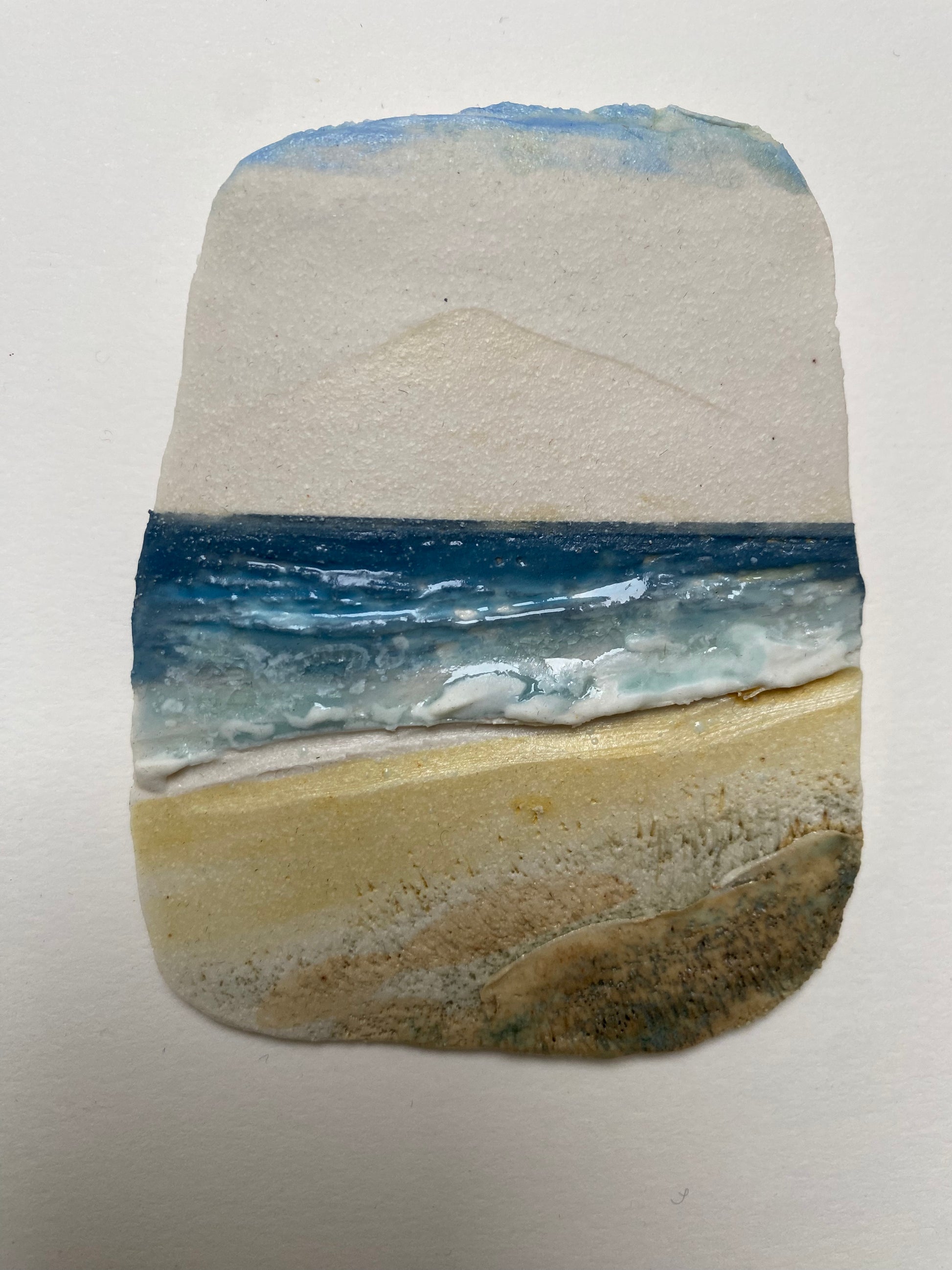 Tiny unmounted seascape, in gift box, hooked and ready to hang