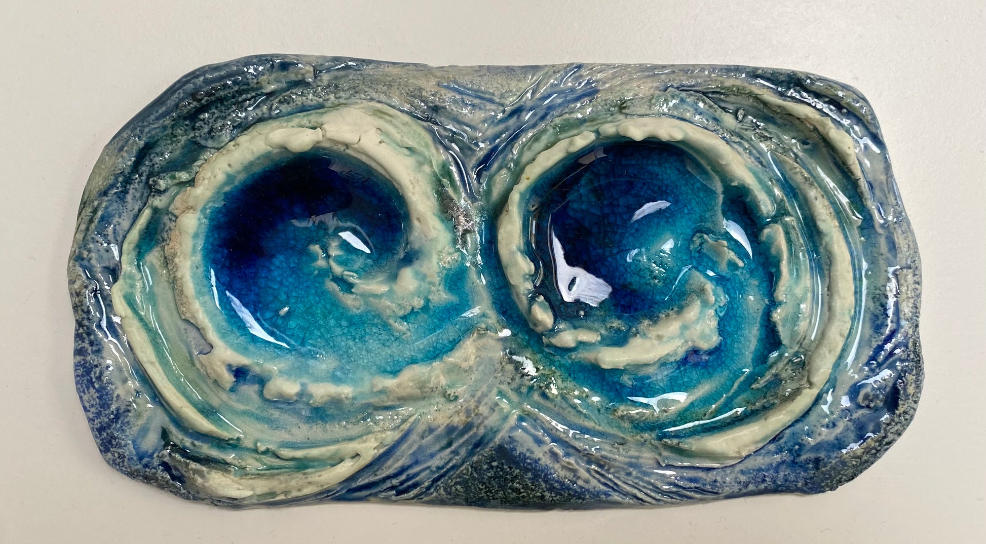 Porcelain wall piece, depicting two tumbling, playful waves, mounted on board