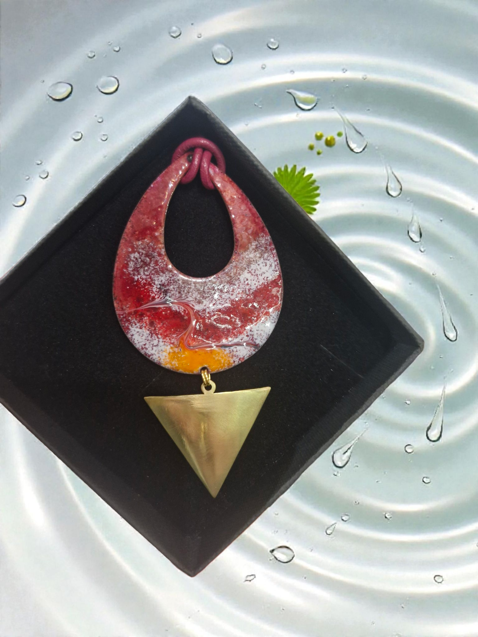 Wildfire is all about warm, confident colour. The enamel shifts through reds, soft whites and a touch of gold, giving it that lit-from-within look without being fussy. It sits on a matching leather cord that feels natural and easy to wear, and the brass drop adds a strong, modern finish.